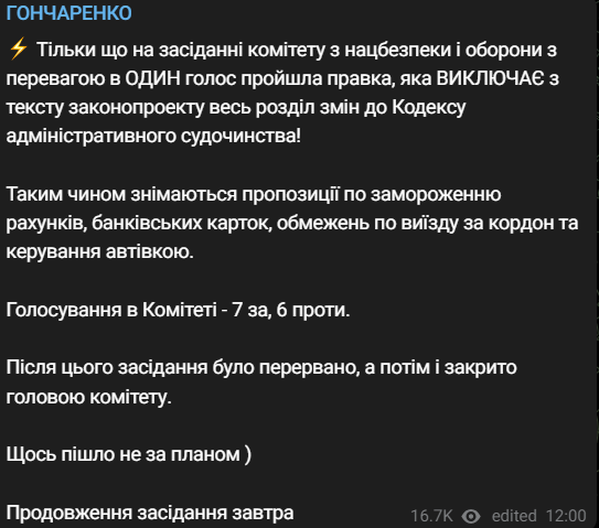 "После недель "бла-бла" о мобилизации Комитет таки начал рассмотрение конкретных правок и споткнулся на первом же вопросе, который подавался, как подготовленный "обсужденный" "тематический блок". А оказалось тратой времени. Сегодня на ограничение прав граждан по обращению ТЦК СП не хватило голосов. Норма исключена. У председателя комитета паника (?) - заседание закрыли", - написала Безуглая.