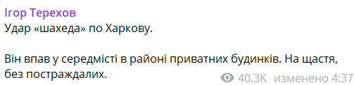 "Удар "Шахеда" по Харькову. Он упал в центре города в районе частных домов. К счастью, без пострадавших", - написал Терехов.