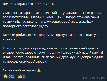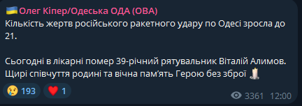 "Число жертв российского ракетного удара по Одессе возросло до 21-го. Сегодня в больнице скончался 39-летний спасатель Виталий Алимов", - заявил глава ОВА.