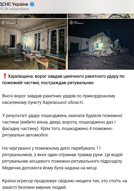 "В результате удара повреждения получило здание пожарной части (выбиты окна, двери, ворота, повреждены крыша и фасадная часть). Кроме того, повреждены четыре пожарно-спасательных автомобиля. На дежурстве в пожарном депо находились 11 спасателей, из которых один получил травму руки. Это водитель-спасатель местного пожарно-спасательного подразделения. Медицинская помощь ему была оказана на месте", - говорится в сообщении.