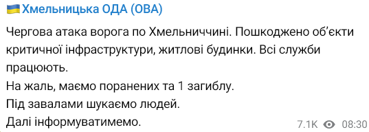 Власти Хмельницкой области сообщили, что есть одна погибшая и раненые, под завалами ищут людей. Также повреждены объект инфраструктуры и жилые дома.