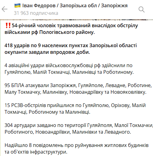 Запорожская областная военная администрация этого не подтверждала. Власти региона заявляли, что по Гуляйполю наносился авиаудар. Также сообщалось об ударах БПЛА и артиллерийских обстрелах. А в общей сводке по области заявляли о повреждении объекта инфраструктуры.