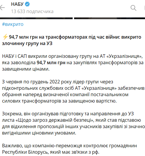 При этом компанию-победителя контролирует гражданин Беларуси, который, по данным НАБУ, имеет связи с РФ. Он закупил трансформаторы в Узбекистане и перепродал УЗ по завышенным почти вдвое ценам.