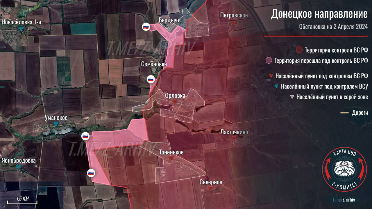 После захвата Авдеевки и оттеснения ВСУ к западу от города ожесточённые бои начались на линии Бердычи - Орловка - Тоненькое.