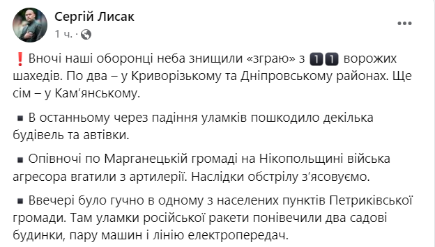 "Ночью наши защитники неба уничтожили "стаю" из 11 вражеских "Шахедов". По два – в Криворожском и Днепровском районах. Еще семь – в Каменском", - написал он.