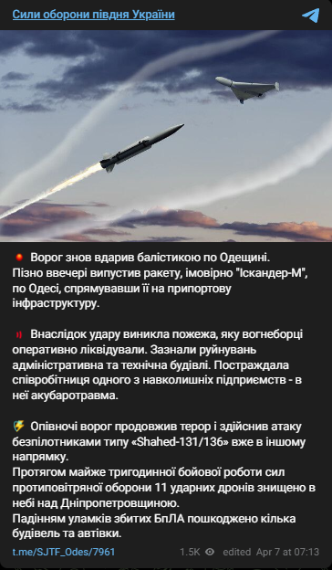 "Враг вновь ударил баллистикой по Одесской области. Поздно вечером выпустил ракету, предположительно "Искандер-М", по Одессе, направив ее на припортовую инфраструктуру", - говорится в сообщении.