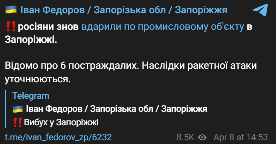 "Россияне снова ударили по промышленному объекту в Запорожье. Известно о шести пострадавших", - написал он.