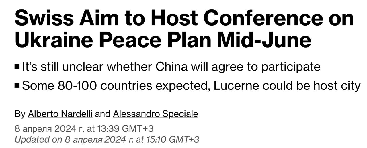 Швейцария намерена провести мирную конференцию по Украине в середине июня 2024 года. Ожидается около 80-100 стран, в том числе, и "глобального Юга".