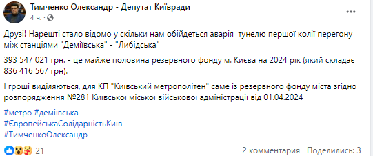 "Ликвидация аварии в тоннеле перегона между станциями "Демеевская" - "Лыбидская" будет стоить 393 547 021 грн. Это почти половина резервного фонда города Киева на 2024 год, размер которого составляет 836 416 567 грн", - заявил он.