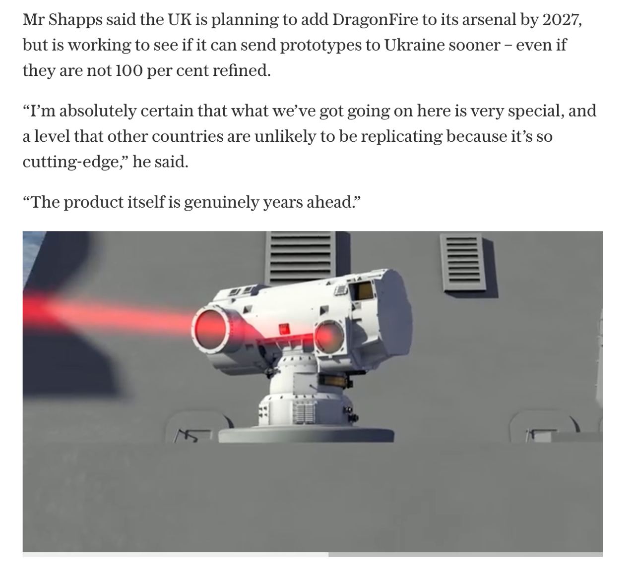 Напомним, DragonFire успешно протестировали в январе этого года. Заявлено, что лазер очень точно бьет прямым лучом, может поражать видимые цели со скоростью света и при этом очень дешевый в использовании.