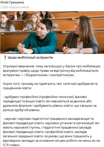 В "Слуге народа" подтвердили, что отсрочка от мобилизации аспирантов сохраняется в новом законопроекте.
