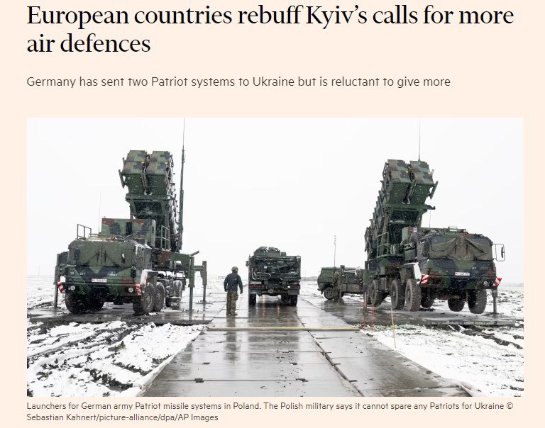 Европейские страны заявили, что не планируют отправлять системы ПВО в Украину, аргументируя это тем, что им необходимо сохранить оборонный потенциал. Германия передала Украине две системы Patriot, но на этой неделе дала понять, что больше не предоставит.