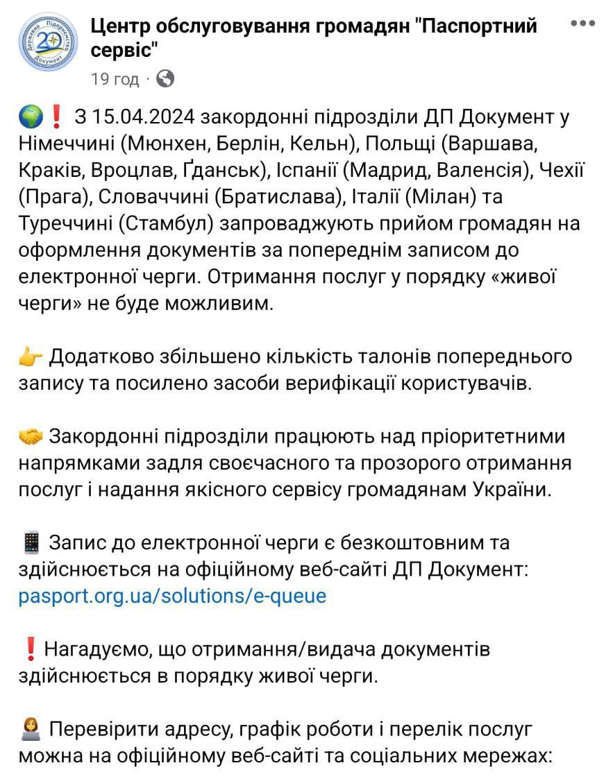 Изменения относятся ко всем подразделениям в Польше, Германии, Испании, Чехии, Италии, Словакии и Турции. Записаться в электронную очередь можно на официальном сайте ГП "Документ".