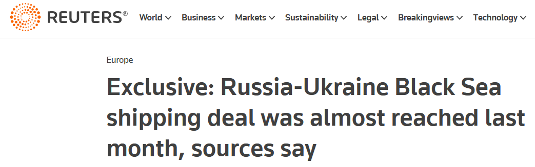 "В соответствии с соглашением, о котором почти было объявлено 30 марта, и Москва, и Киев предлагали гарантии безопасности торговым судам в Черном море, обязуясь не наносить удары, не арестовывать и не обыскивать их, пока они либо пусты, либо заполнены грузом гражданского назначения", - пишет Reuters.