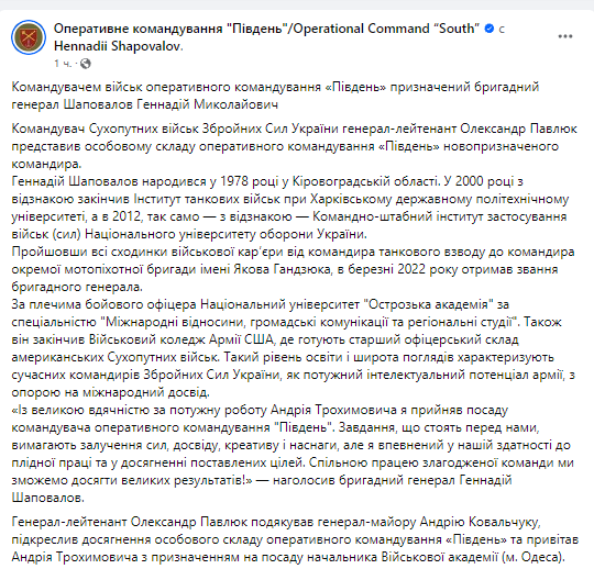 В сообщении Оперативного командования отмечается, что генерал-лейтенант Александр Павлюк, командующий Сухопутными войсками Вооруженных сил Украины, представил Шаповалова личному составу.