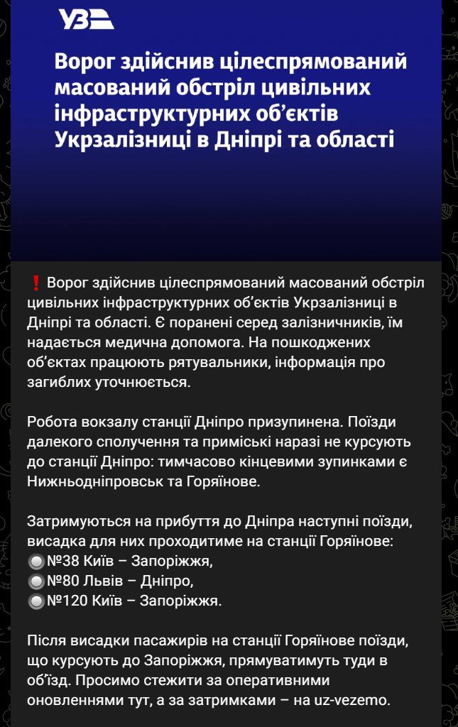 Есть раненые среди железнодорожников. Работа вокзала в Днепре приостановлена, туда не ходят поезда дальнего сообщения: временно конечными остановками являются Нижнеднепровск и Горяиново.