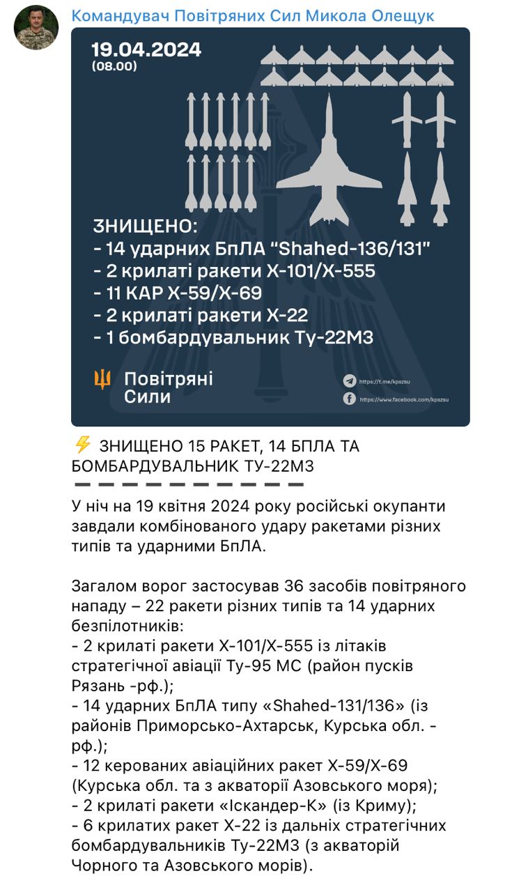 09.05 Россияне применили против Украины ночью и утром 22 ракеты и 14 ударных беспилотников. Сбито 15 ракет и все дроны, заявили в командовании Воздушных сил.