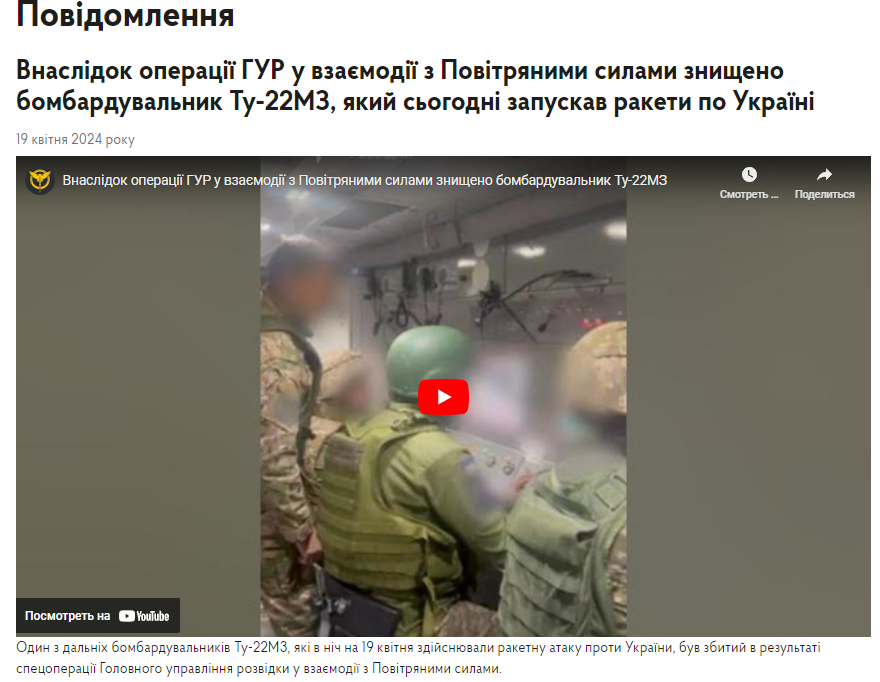 "Вражеский самолет Ту-22МЗ удалось сбить на расстоянии около 300 километров от Украины теми же средствами, которыми ранее был поражен российский самолет дальнего радиолокационного обнаружения и управления А-50. В результате поражения бомбардировщик смог долететь в район Ставрополя, где упал и разбился", - говорится в заявлении.