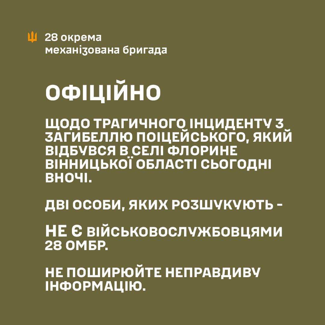 Ранее в 28-й бригаде опровергли, что мужчины, застрелившие полицейского в Винницкой области, служат в этом соединении.