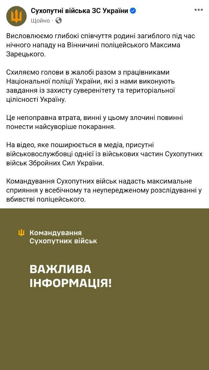 "На видео, которое распространяется в СМИ, присутствуют военнослужащие одной из воинских частей Сухопутных войск Вооруженных Сил Украины. Командование Сухопутных войск окажет максимальное содействие во всестороннем и беспристрастном расследовании в убийстве полицейского" - говорится в сообщении.