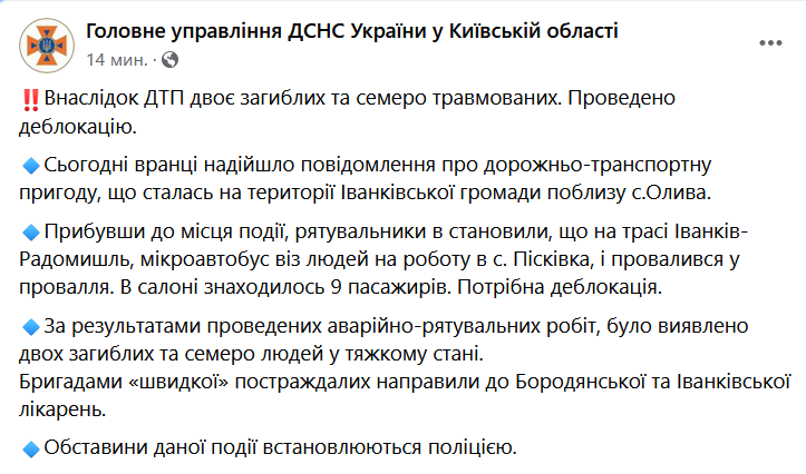 "В результате проведенных аварийно-спасательных работ были обнаружены двое погибших и семь человек в тяжелом состоянии. Бригадами скорой пострадавших направили в Бородянскую и Иванковскую больницы", - сообщили в ГСЧС.