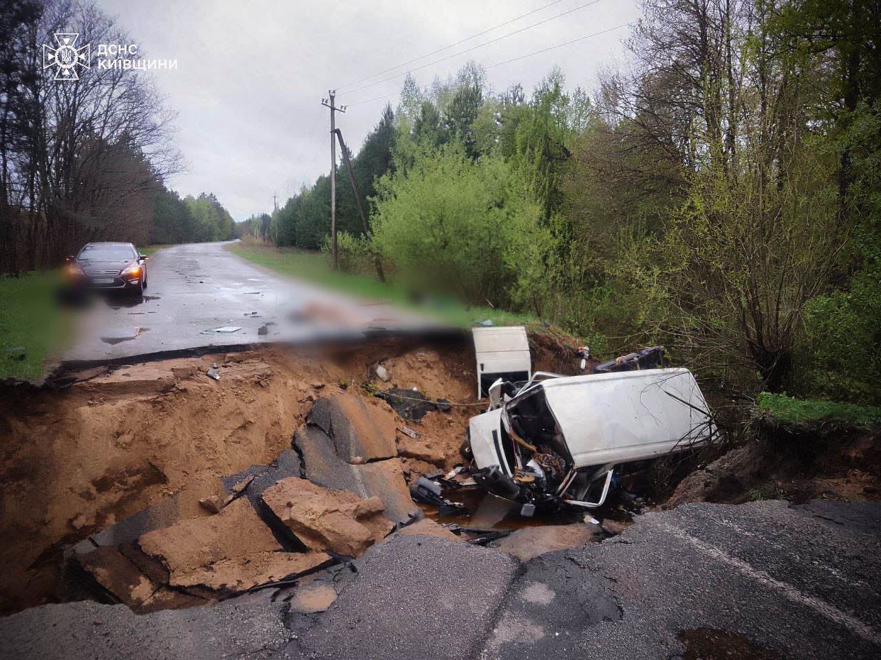 Дорога обвалилась на трассе Иванков-Радомышль около села Олива. Микроавтобус вез людей на работу.