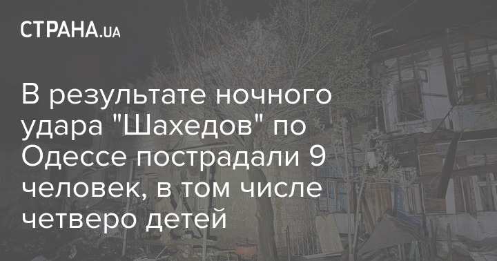 "По уточненным данным, в результате ночной атаки россиян по Одессе, пострадали 9 человек, 4 из них - дети 12 и 9 лет, а также двое, которым нет и года. Трое взрослых госпитализированы в медучреждения города, они в состоянии средней степени тяжести, еще двое отказались от госпитализации, получив всю необходимую помощь на месте", - сообщает Кипер.