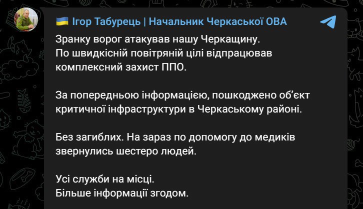 08.10 В районе Черкасс поврежден объект критической инфраструктуры, сообщил начальник ОВА Табурец.