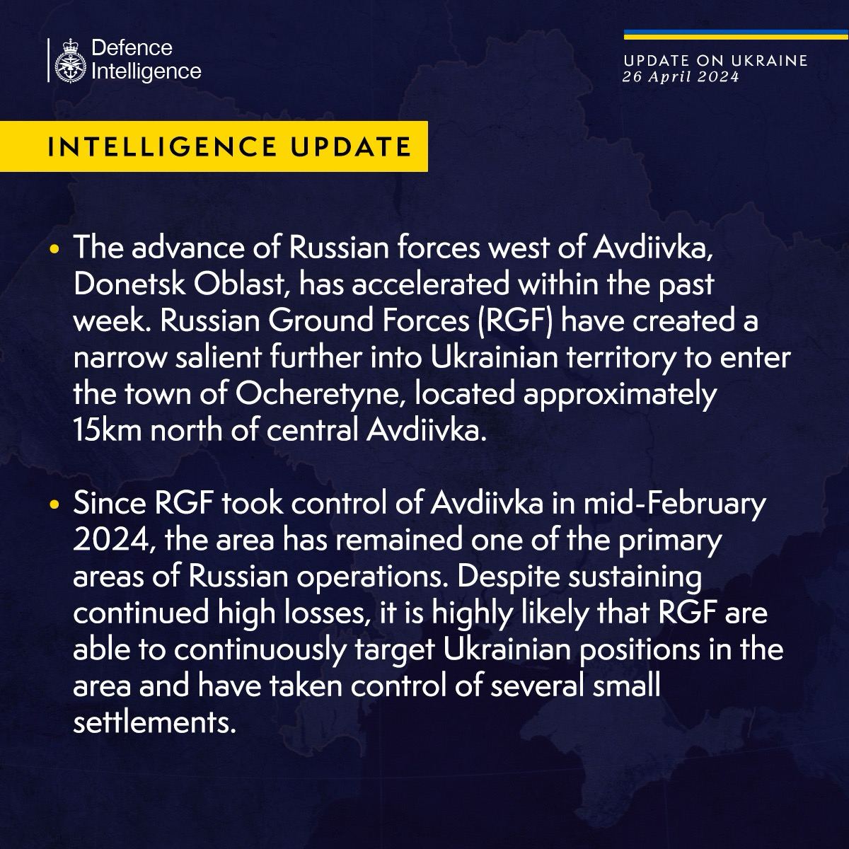 12.55 Армия РФ продолжит продвигаться на авдеевском направлении и с высокими потерями сможет захватить еще несколько небольших населенных пунктов, прогнозирует британская разведка.