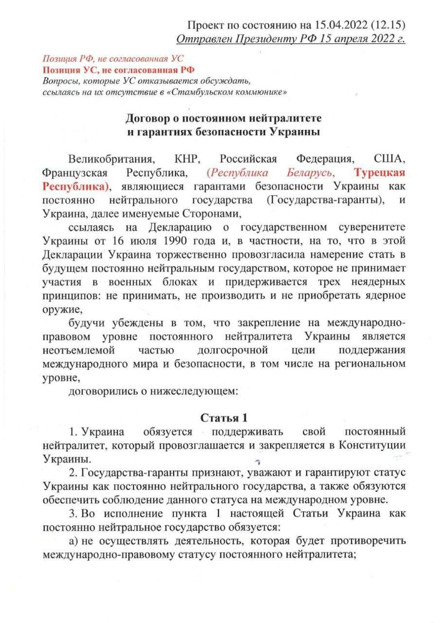 21.23 Скан первой страницы проекта договора о нейтралитете Украины, который должен был лечь в основу мирных договоренностей Украины и России по окончанию войны весной 2022 года.