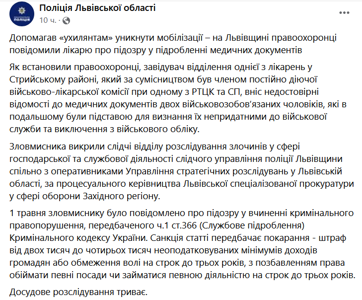 Врач помогал уклонистам. Фото: Facebook/MVS.LVIV
