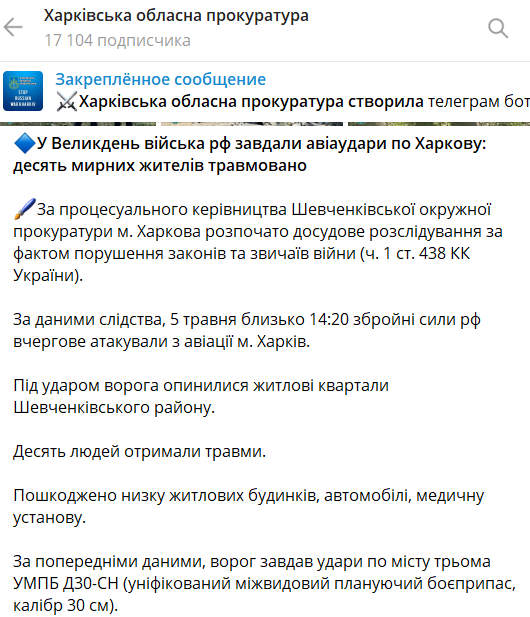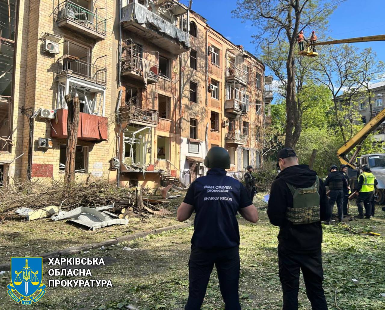 "По данным следствия, 5 мая около 14:20 вооруженные силы России в очередной раз атаковали с помощью авиации г. Харьков. Под ударом врага оказались жилые кварталы Шевченковского района. Десять человек получили травмы. Повреждены жилые дома, автомобили, медицинское учреждение.