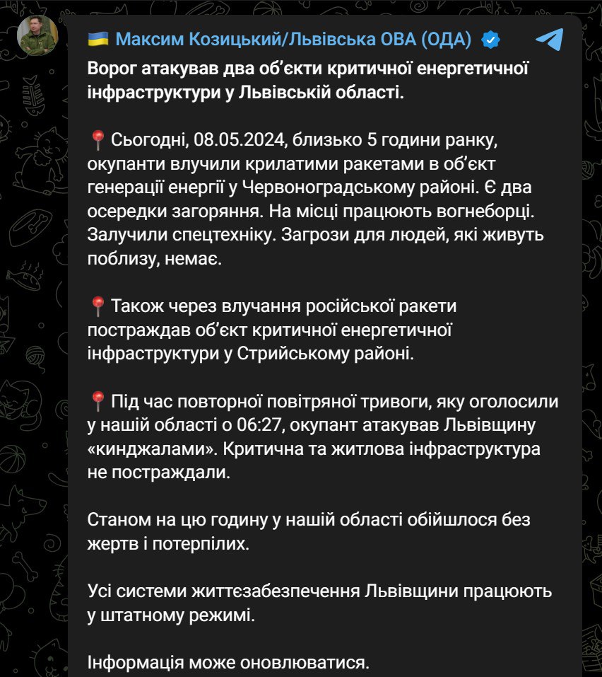 Россияне ночью 8мая атаковали два объекта критической энергетической инфраструктуры во Львовской области.