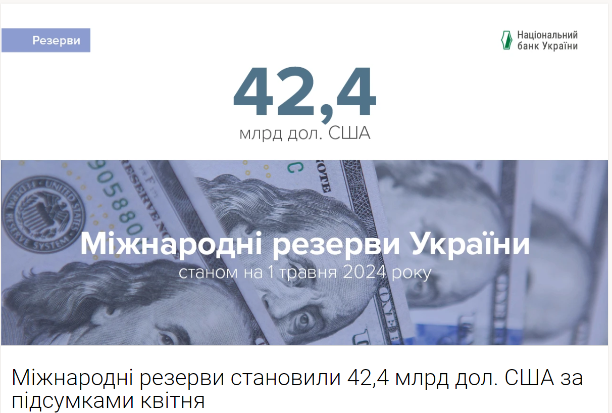 По итогам апреля 2024 года общий размер золотовалютных резервов Нацбанка сократился на 3,1%, и достиг $42,4 млрд. А размер чистых ЗВР просел вообще на 4,1% — с $31,8 млрд до $30,5 млрд.