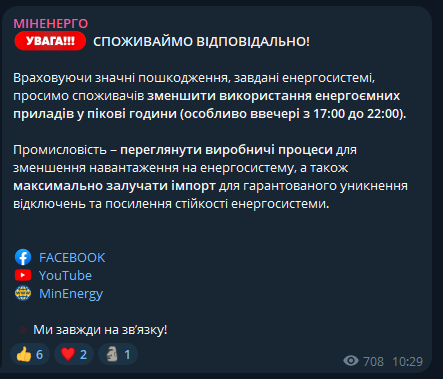 Также "Укрэнерго" ввела ограничение потребления электричества для промышленных потребителей. В энергосистеме образовался дефицит электроэнергии, который не способен полностью покрыть даже импорт электроэнергии из Европы.