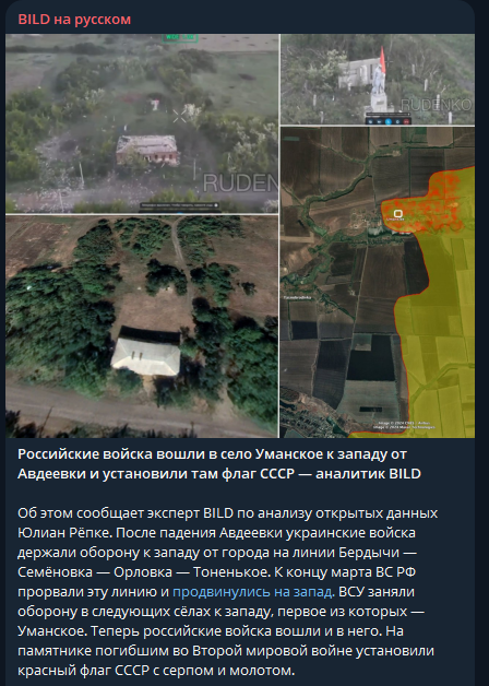 Военный аналитик немецкого издания Bild Юлиан Репке заявил, что российская армия вошла в село Уманское на Авдеевском направлении. Россияне водрузили флаг СССР на памятнике погибшим во Второй мировой войне в этом населенном пункте.
