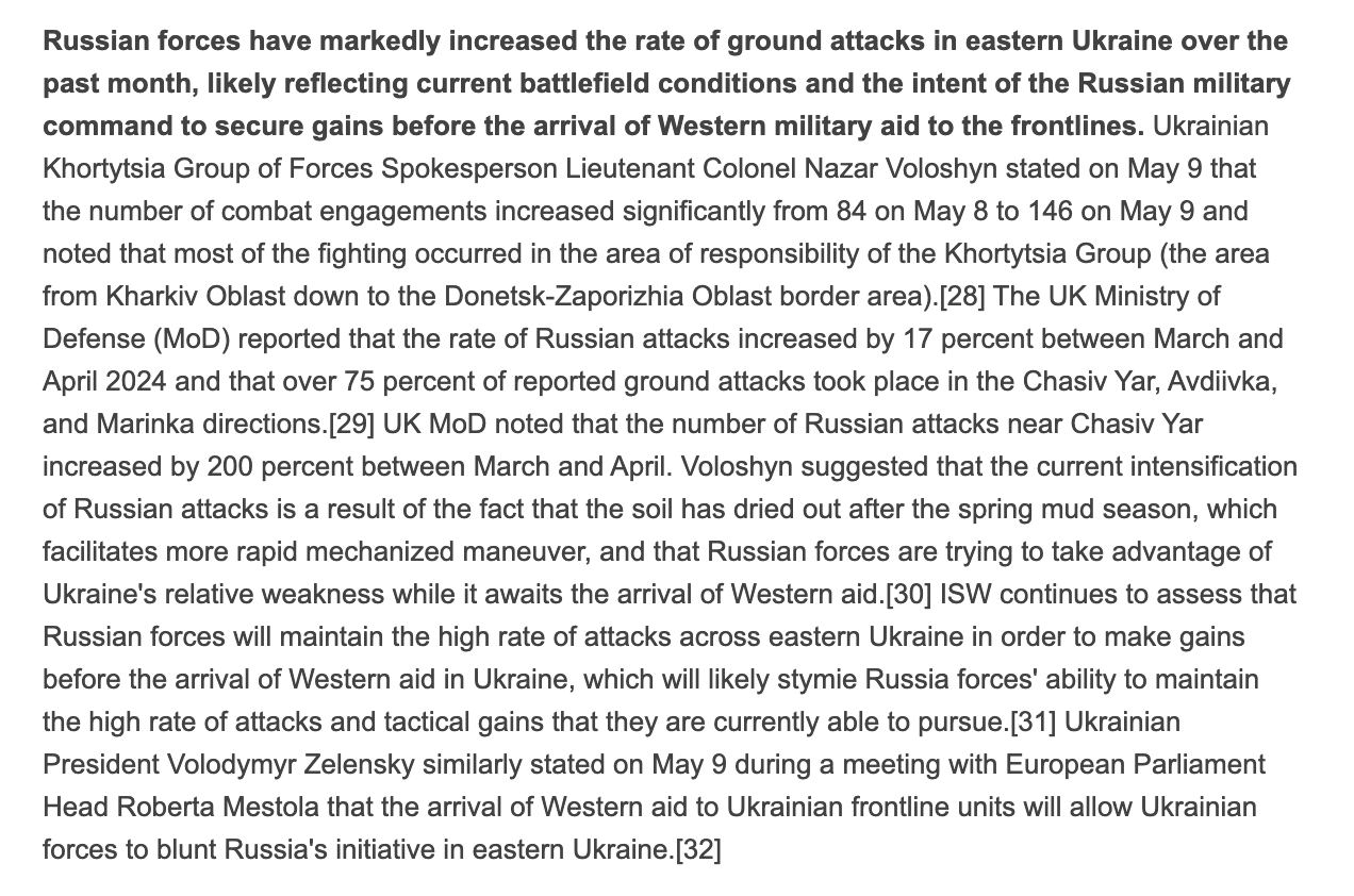 Также делается вывод о том, что пока наступательные действия россиян носят отвлекающий характер и ограничены в своих механизированных возможностях. Однако в посадках на территории РФ "содержатся дополнительные силы, которые могут быть применены в случае случайного успеха, как, например, в Очеретино".