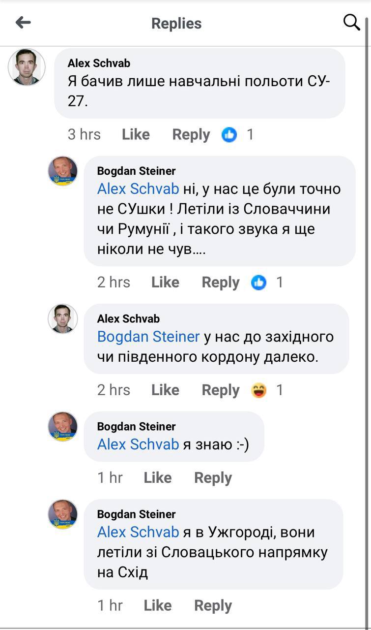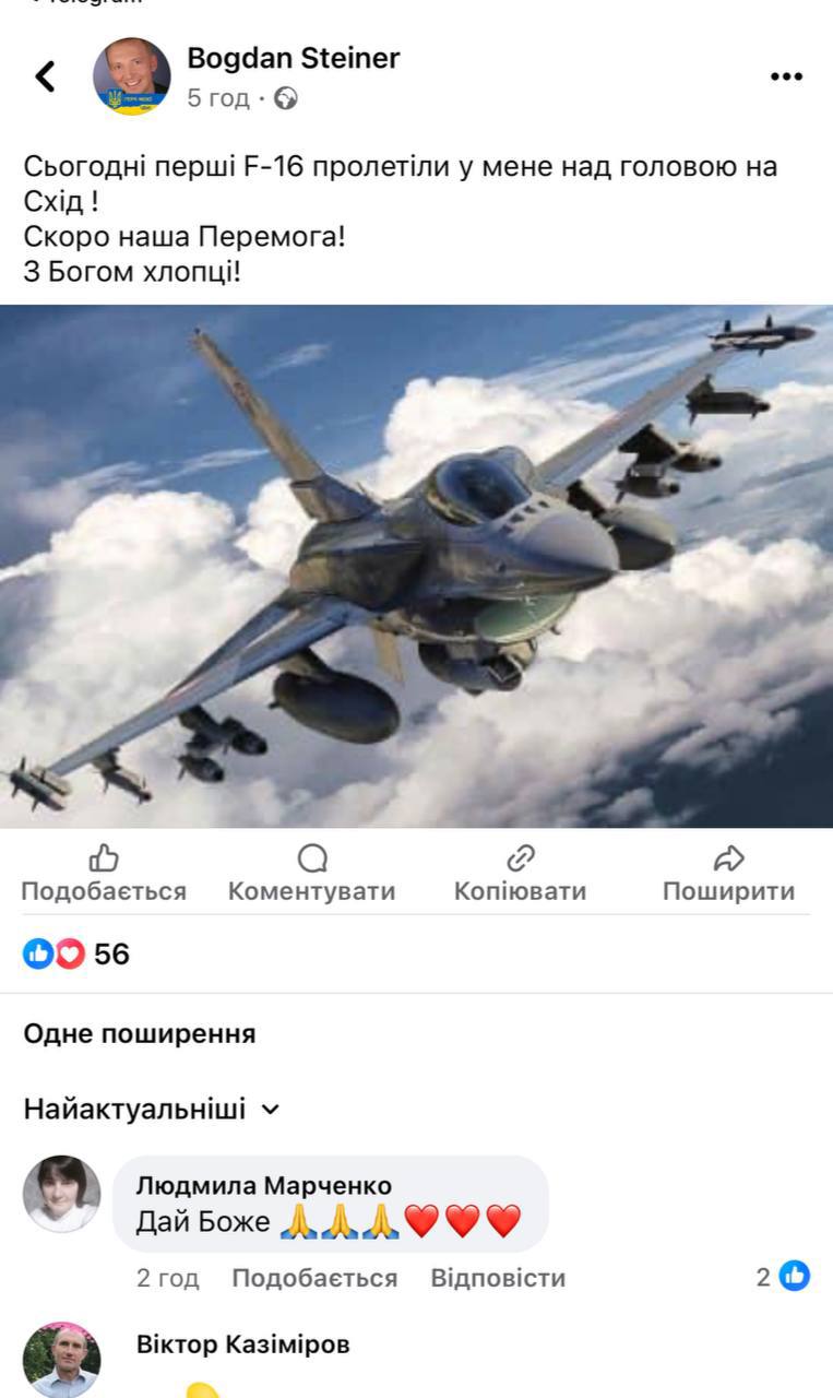"Сегодня первые F-16 пролетели у меня над головой на восток", – написал в Фейсбуке житель Закарпатья Богдан Штайнер.