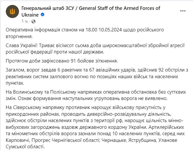 В пятницу, 10 мая, в Украине идет 807-й день войны с Россией.