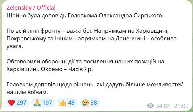 "Только что был доклад Главкома Александра Сырского. По всей линии фронта – тяжелые бои. Направлениям в Харьковской, Покровском и другим направлениям в Донецкой области – особое внимание. Обсудили оборонные действия и усиление наших позиций в Харьковской области. Отдельно – Часов Яр. Главком доложил о решениях, которые дадут больше возможностей нашим воинам", – говорится в сообщении Зеленского.