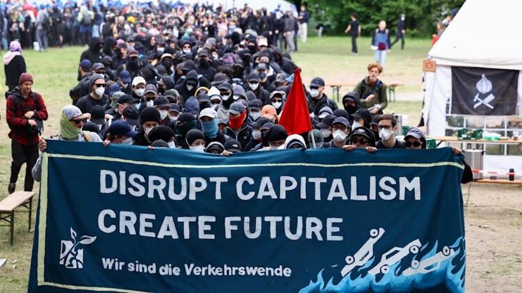 Со вчерашнего дня у завода собралось около 1200 активистов со всей Европы. Они разбили палатки под флагами Палестины и немецкого террористического движения RAF ("Фракция Красной армии"), требуя остановить расширение завода.