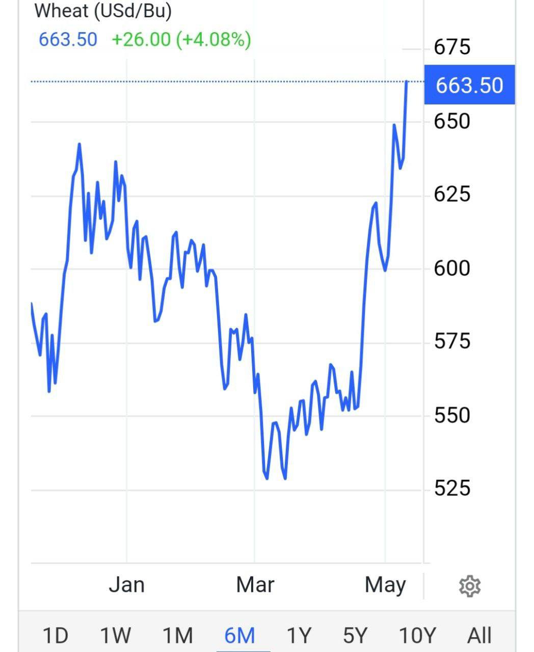 На торгах 10 мая фьючерсы на пшеницу с поставкой в июле в моменте подорожали на 3,54%, до $6,6 за бушель (один бушель равен 27,2 кг), о чем говорят данные торгов на Чикагской товарной бирже (CBOT). Сегодня рост замедлился до 2,76%, а цена фьючерса скорректировалась до $6,55 за бушель.
