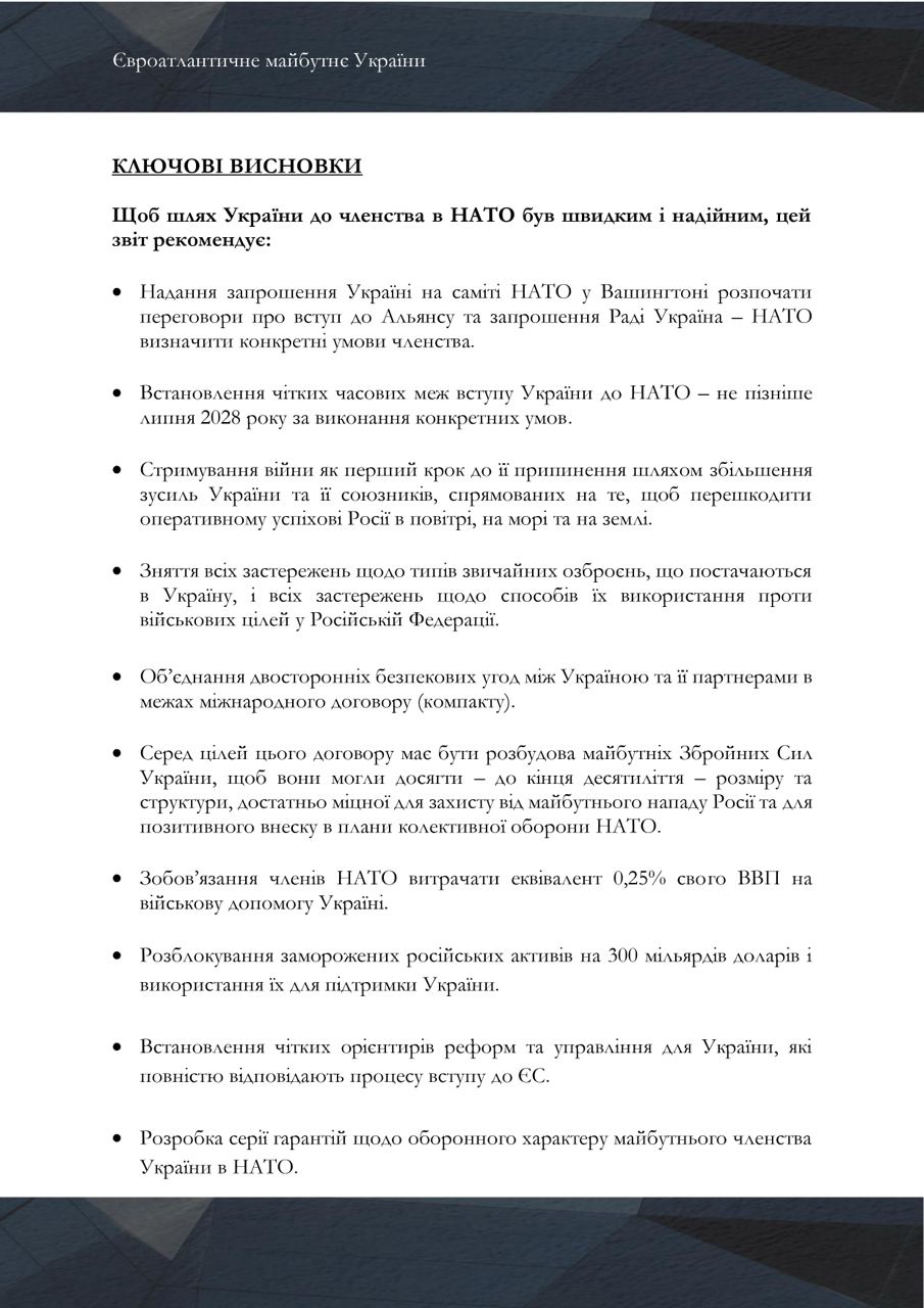 НАТО должно дать приглашение Украине на вступление в Альянс на саммите в Вашингтоне этим летом и закрепить обязательство принять Украину в свои ряды не позднее июля 2028 года.