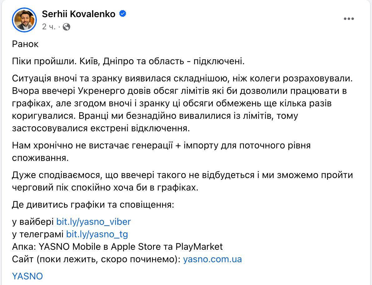 "Вчера вечером "Укрэнерго" довел объем лимитов, которые позволили бы работать в графиках, но впоследствии ночью и утром эти объемы ограничений еще несколько раз корректировались. Утром мы безнадежно вывалились из лимитов, поэтому применялись экстренные отключения", - написал он.