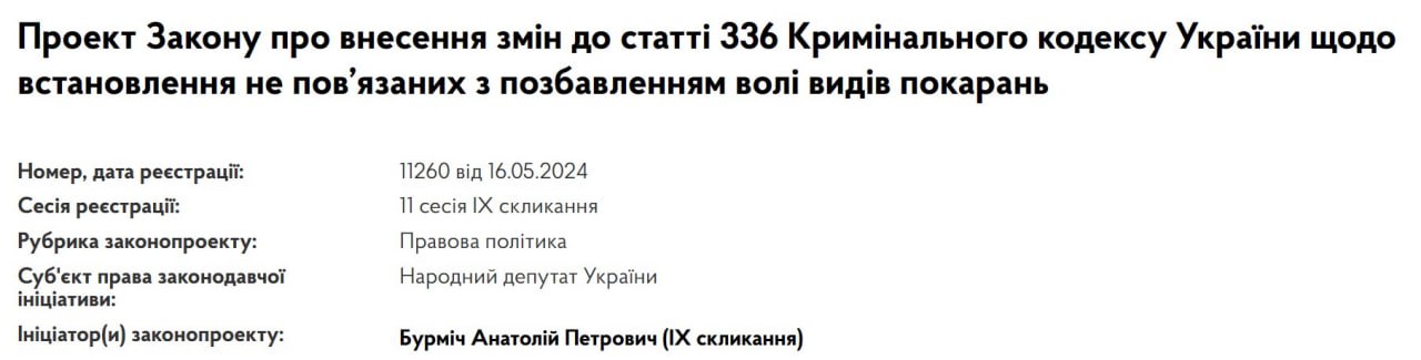 Он внес Раду соответствующий законопроект. В документе предлагается заменить лишение свободы от 3 до 5 лет на штраф 51- 85 тысяч грн или общественные работы на срок от 160 до 240 часов, или ограничение свободы до двух лет.