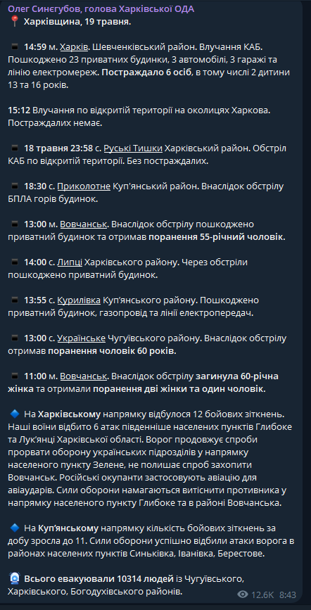 Об этом сообщает глава Харьковской ОВА Олег Синегубов.