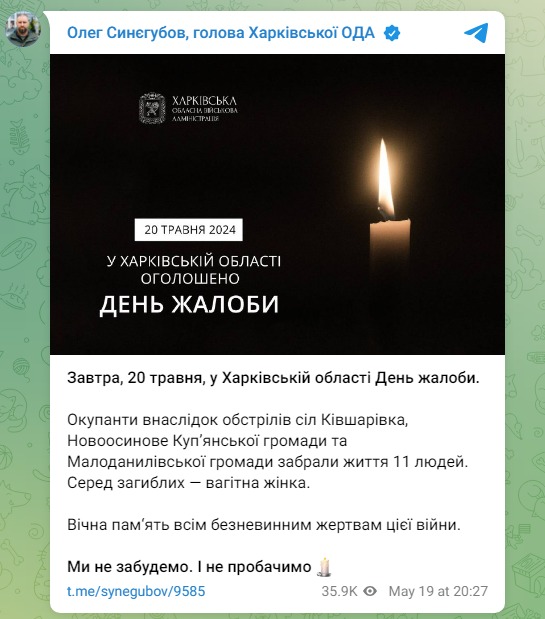 Завтра, 20 мая, в Харьковской области объявляется день траура.