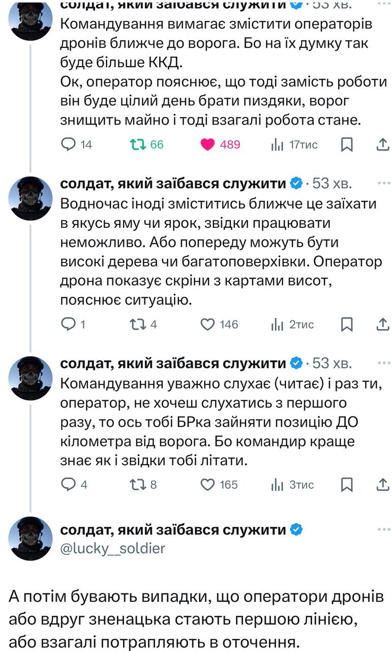 Согласно рассказу одного из военных, командование считает, что операторов дронов нужно размещать ближе к противнику: там, по его мнению, от них больше пользы. При этом операторы пытаются объяснить, что работа на "нуле" угрожает уничтожением всего оборудования или создает ситуацию, когда управление дронами невозможно.