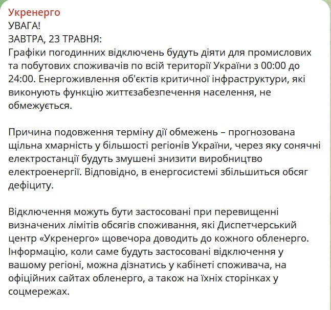 В четверг, 23 мая, графики почасовых отключений электроэнергии будут действовать для всех потребителей в Украине с 00.00 до 24.00.