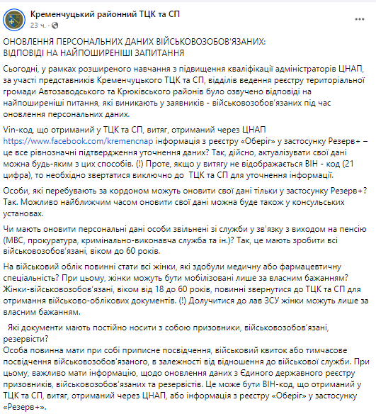 • информацию об обновлении учетных данных из Единого реестра призывников, военнообязанных и резервистов. Это может быть ВИН-код, полученный в ТЦК и СП (его вклеивают в военный билет), выписка, полученная через ЦПАУ (центр предоставления административных услуг) или информация из реестра "Оберег" в приложении "Резерв+".